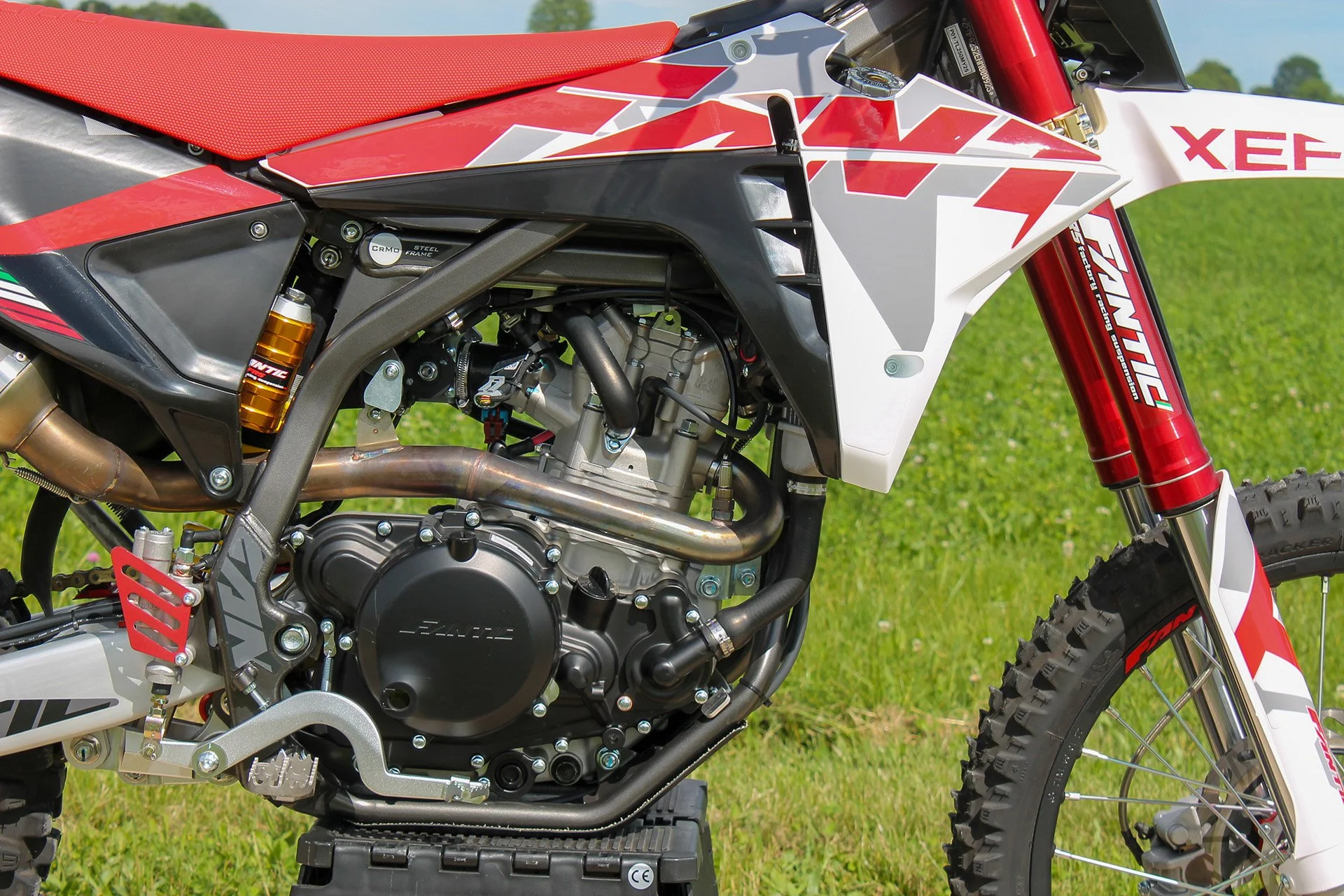 Chassis - The CrMo steel perimeter frame of the Enduro XEF has been optimised in terms of rigidity thanks to the placement of new reinforcements for the benefit of the ride. The XEF250 is equipped with a FANTIC FRS 43mm USD racing-derived fork, and FANTIC FRS 250 Piggyback monoshock - preload and hydraulic adjustment. The swingarm is made of aluminium with variable section and removable rear frame. Enduro tires 90/90x21 - 120/90x18 mounted on aluminum rims. Powerful and modular 260mm front and 220mm rear wave brake discs.